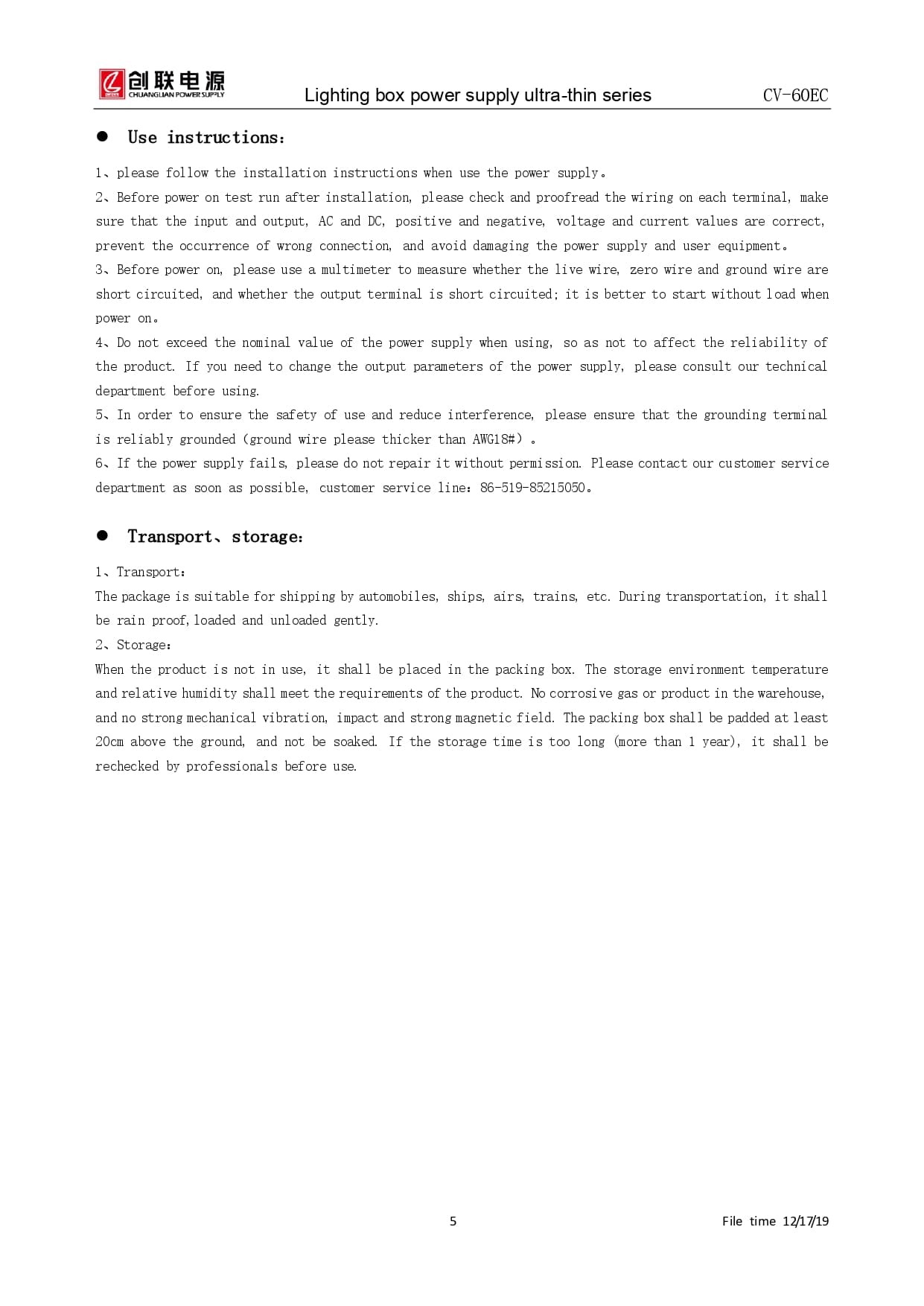 Product Type: Switching Power Supply Slim ModelBrand: CHUANGLIANProduct model name: CV-60EC-12 |