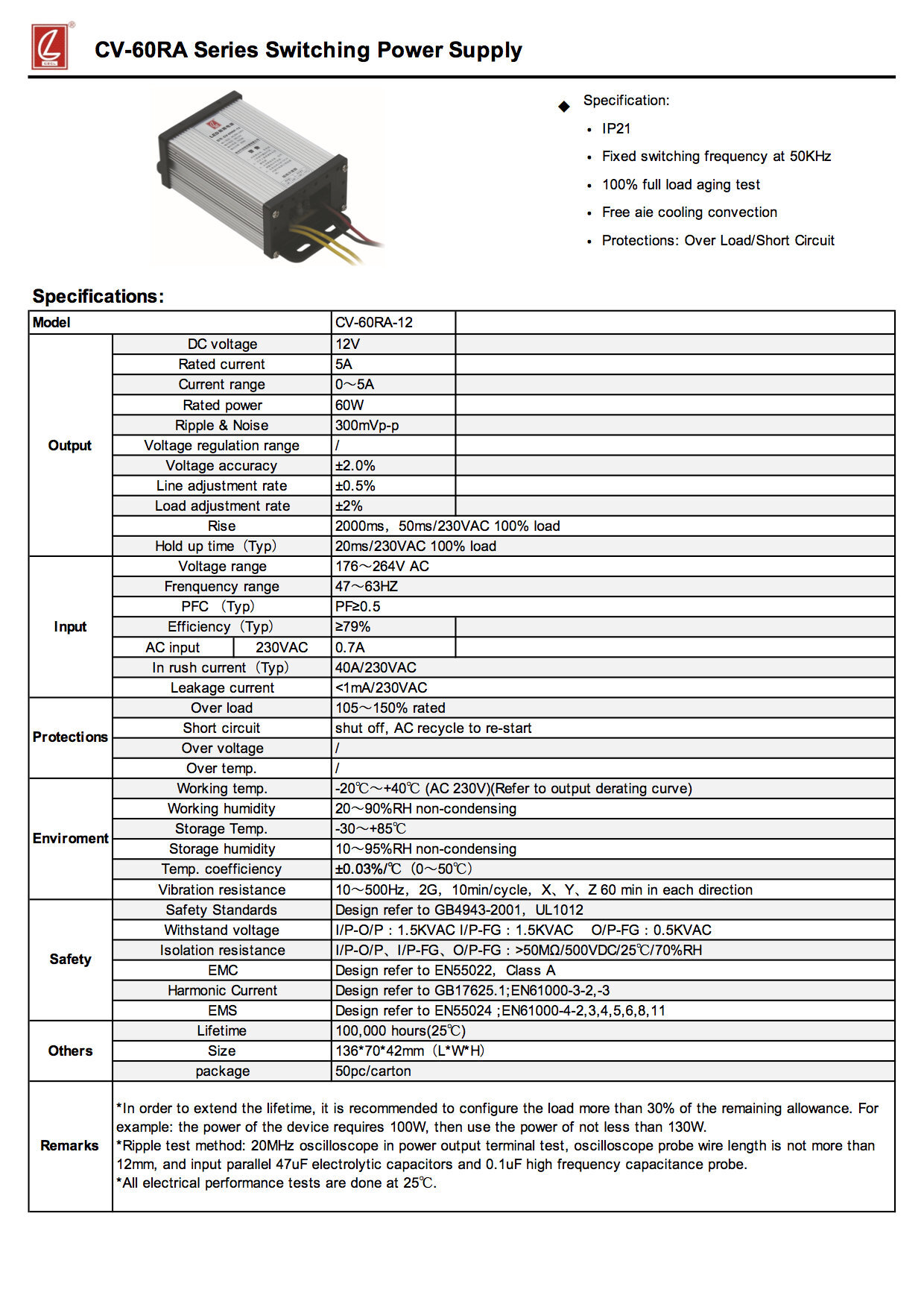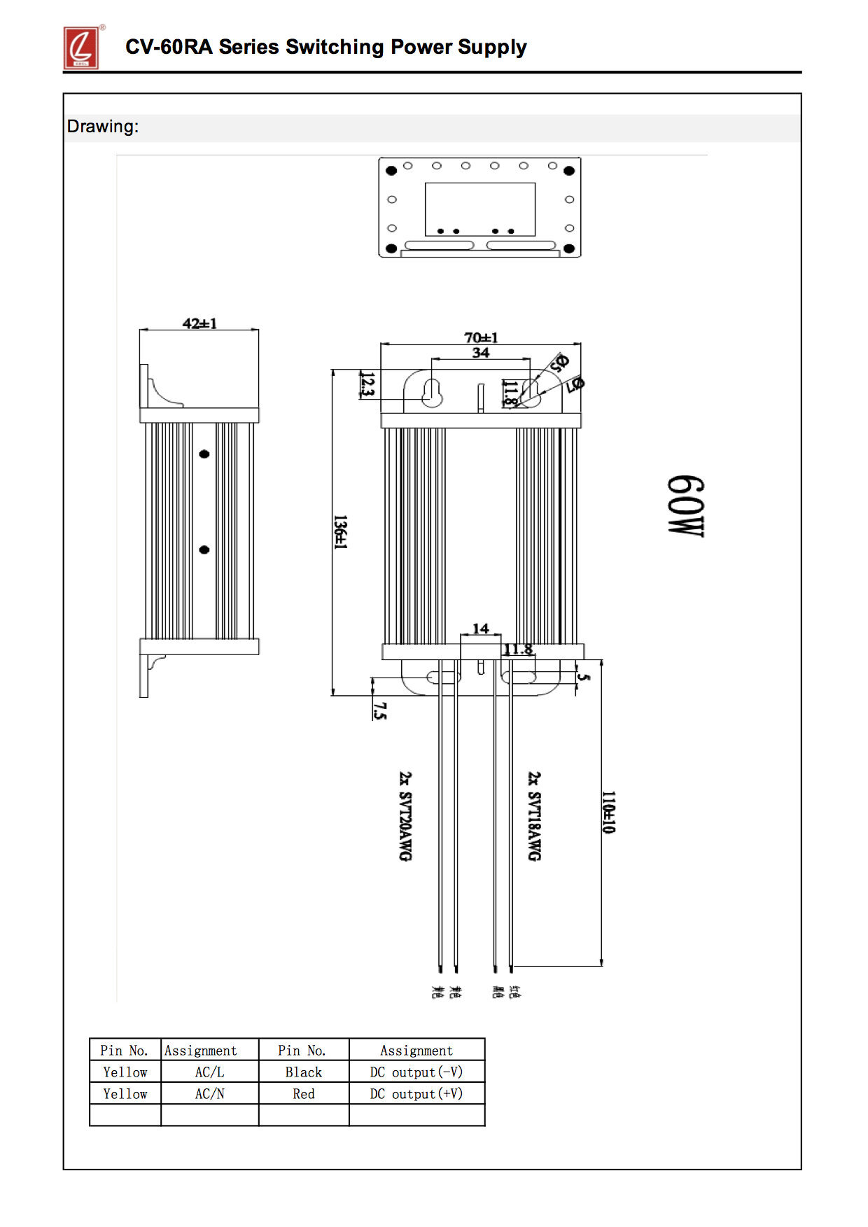Product Type: Power supply waterproof modelBrand: CHUANGLIANProduct model name: CV-60RA-12 |