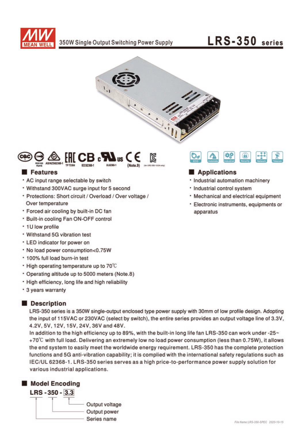 Product Type : Switching Power SupplyBrand: MEAN WELLProduct model name: LRS-350-15 |