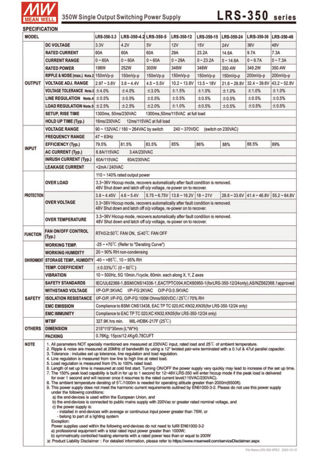Product Type : Switching Power SupplyBrand: MEAN WELLProduct model name: LRS-350-48 |