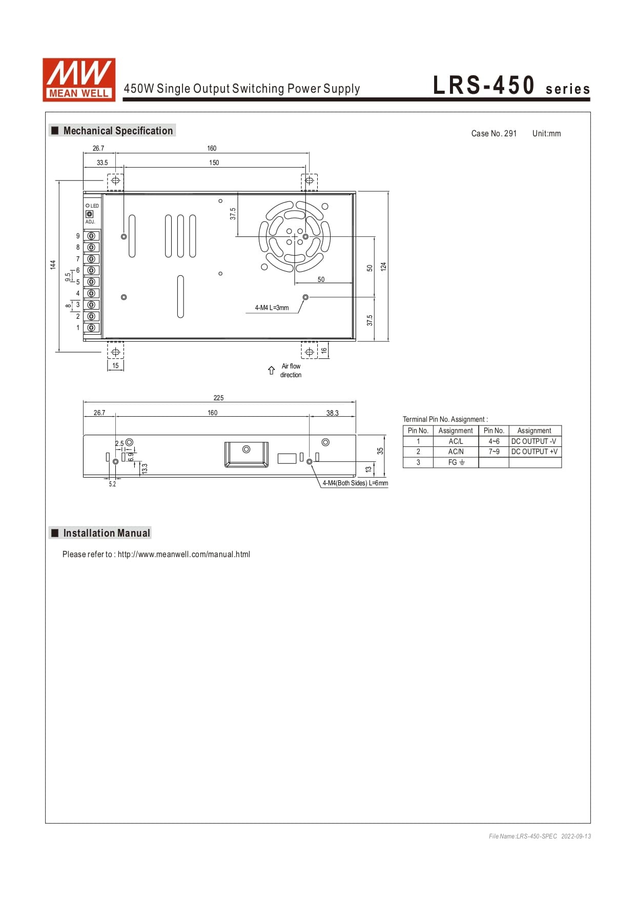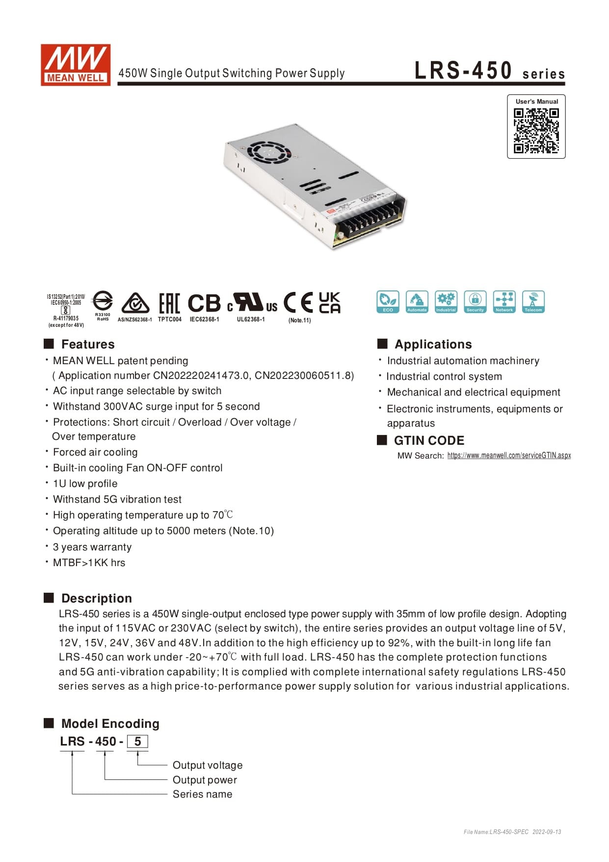 Product Type : Switching Power SupplyBrand: MEAN WELLProduct model name: LRS-450-12 |