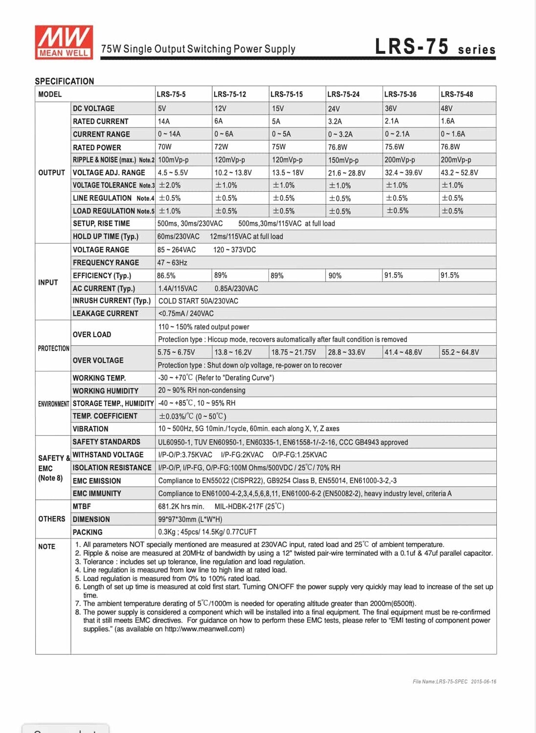 Product Type : Switching Power SupplyBrand: MEAN WELLProduct model name: LRS-75-12