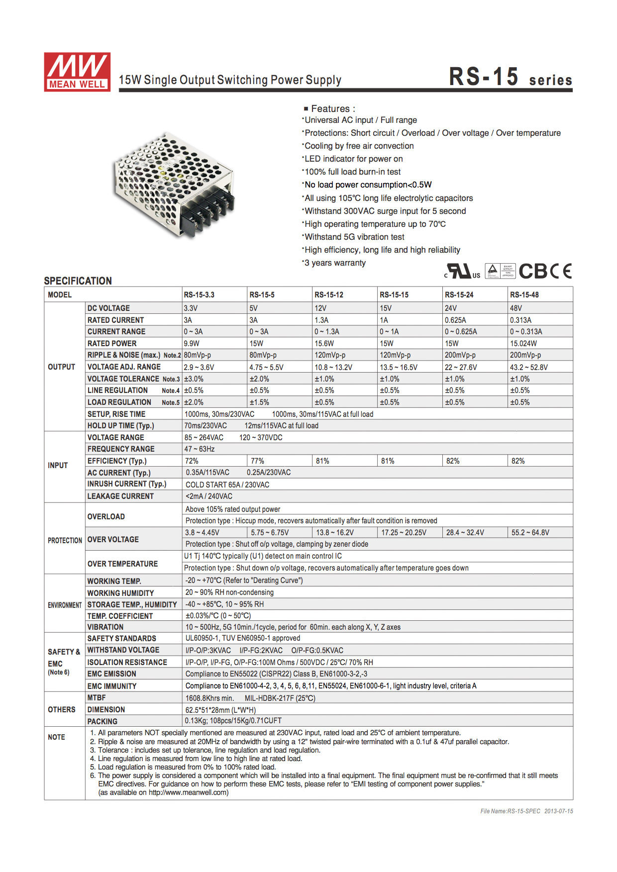 Product Type : Switching Power SupplyBrand: MEAN WELLProduct model name: RS-15-12 |