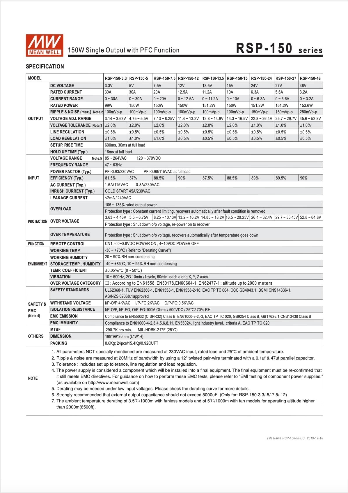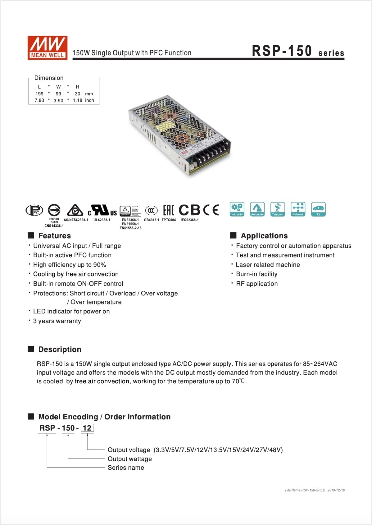 Product Type : Switching Power SupplyBrand: MEAN WELLProduct model name: RSP-150-12 |