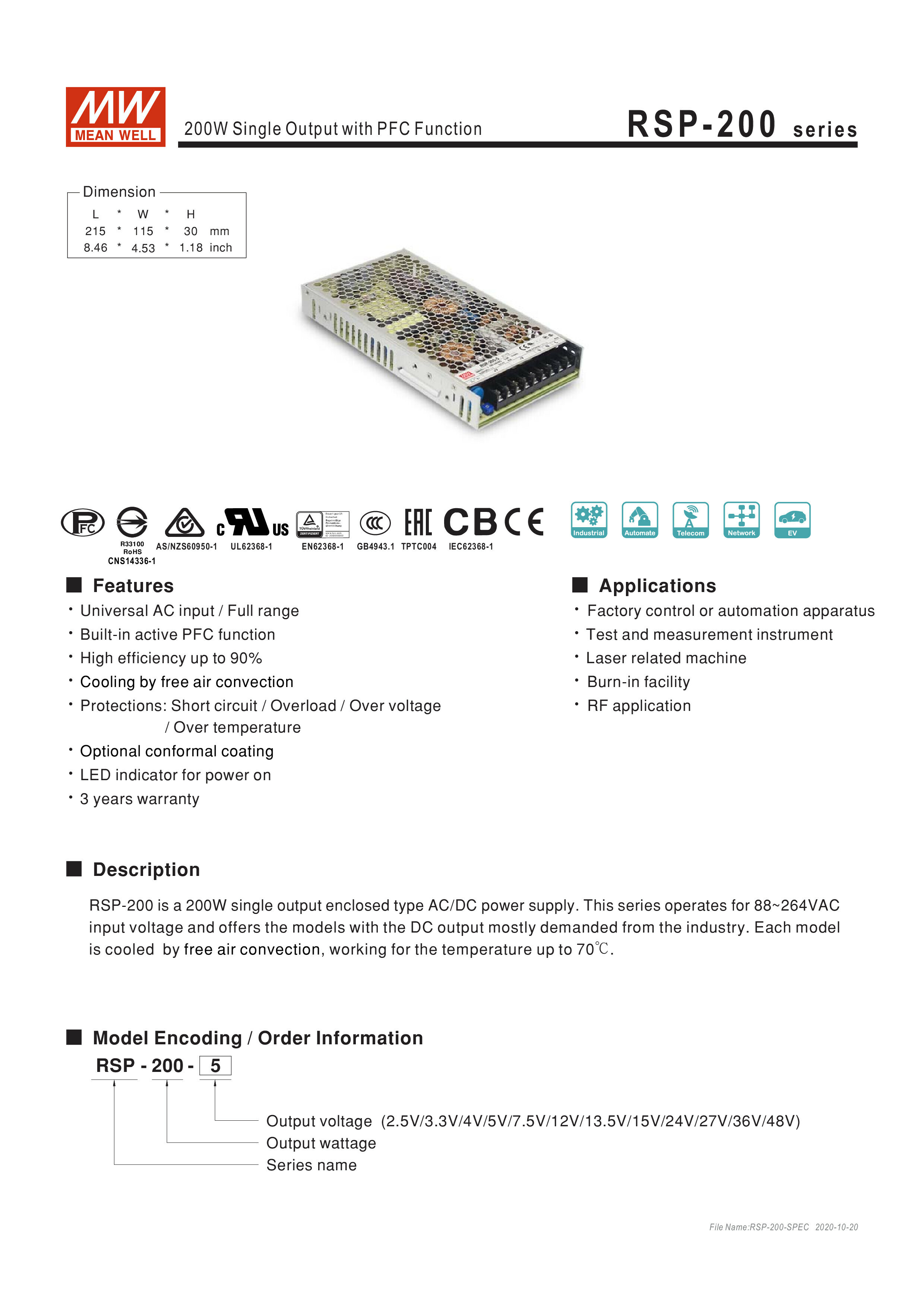 Product Type : Switching Power SupplyBrand: MEAN WELLProduct model name: RSP-200-24 |