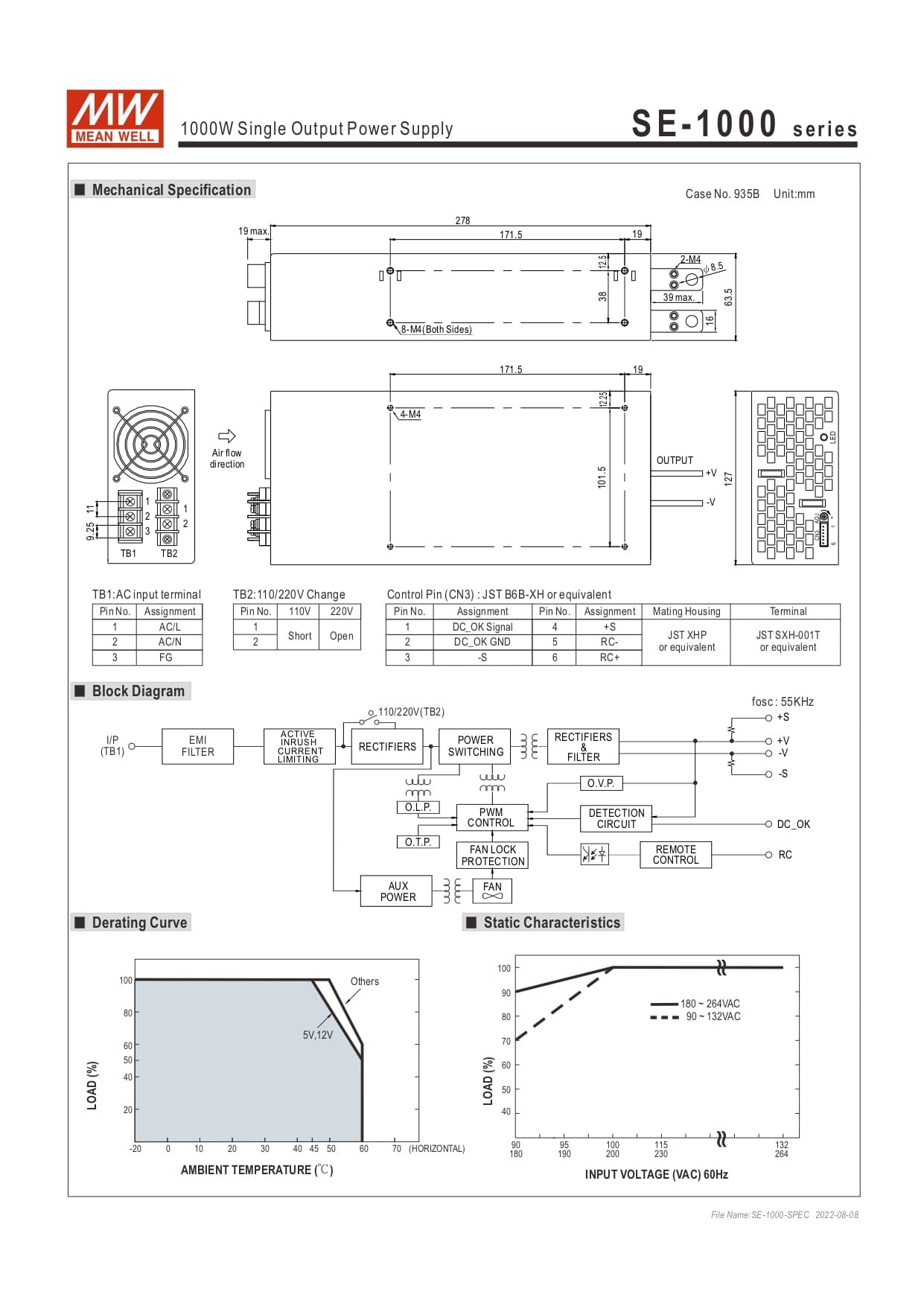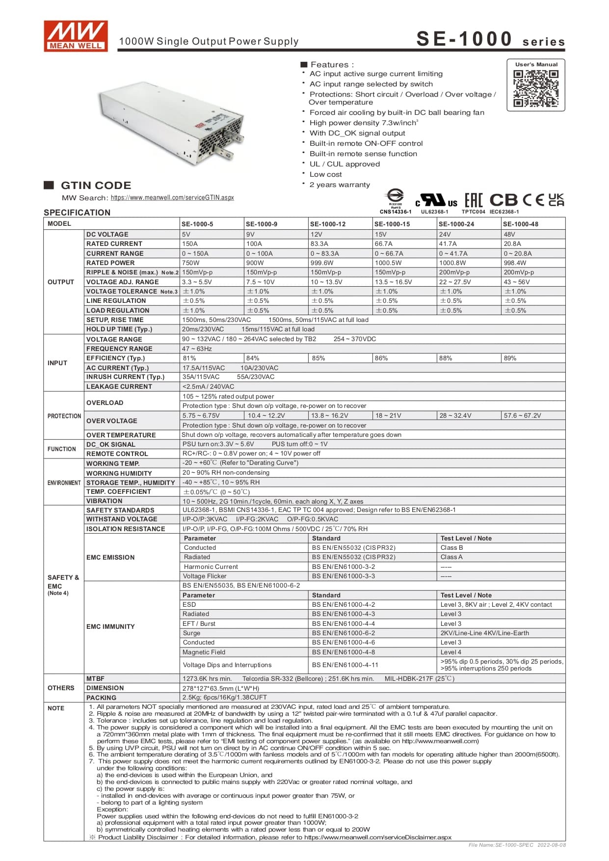 Product Type : Switching Power SupplyBrand: MEAN WELLProduct model name: SE-1000-48 |