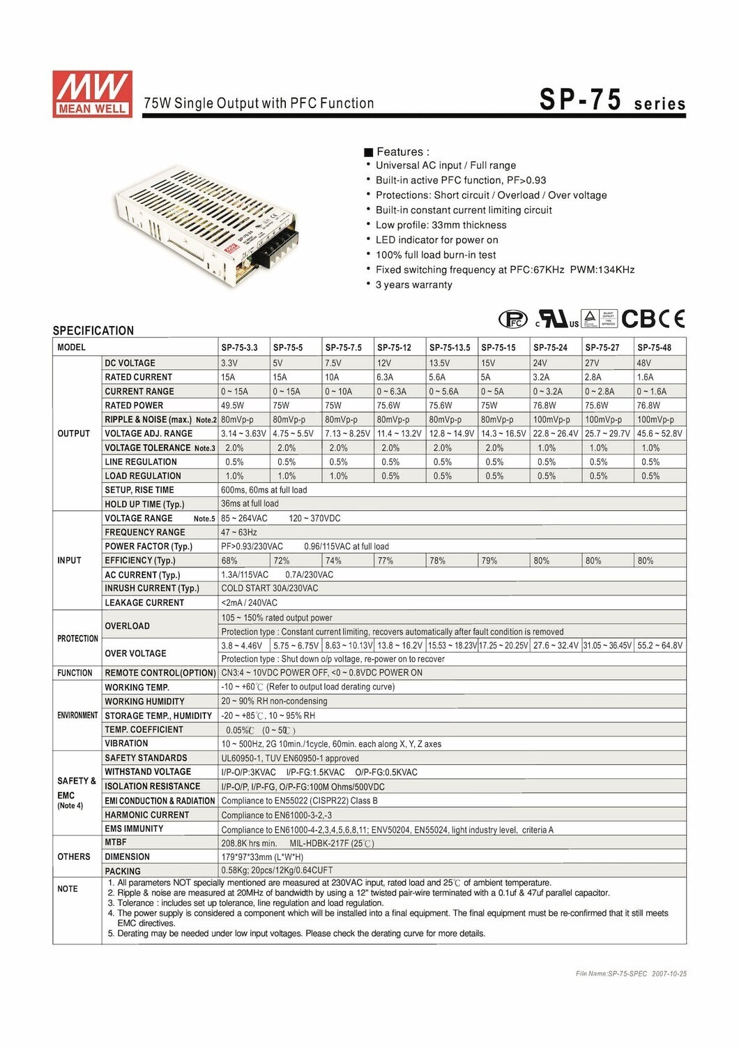 Product Type : Switching Power SupplyBrand: MEAN WELLProduct model name: SP-75-12 |